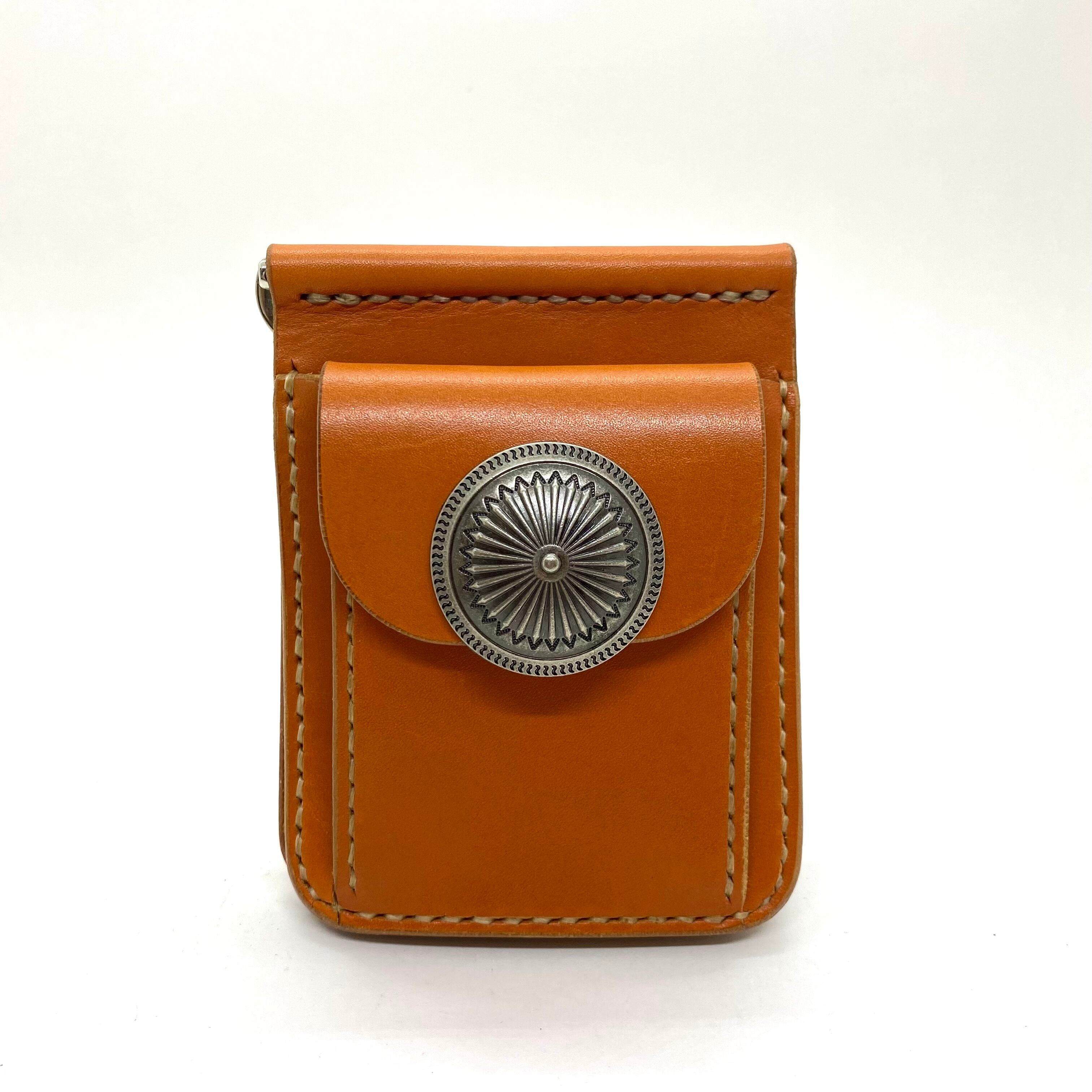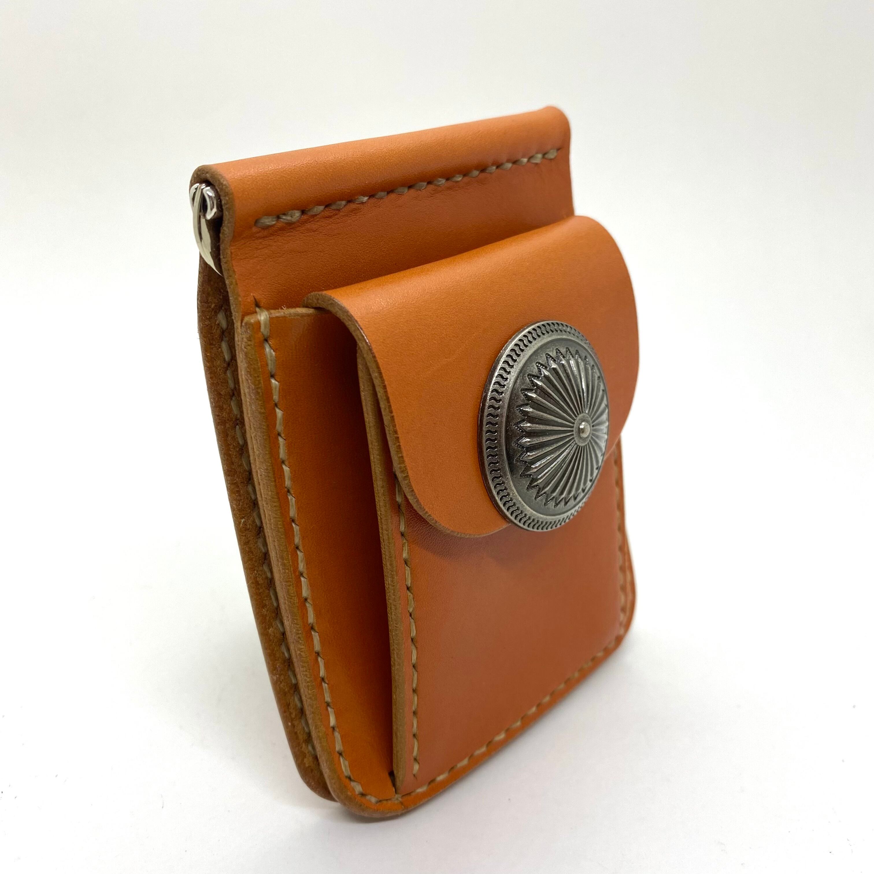 【即納☆送料無料】本革レザー ショート財布 マネークリップ フラワー コンチョボタン オレンジキャメル
