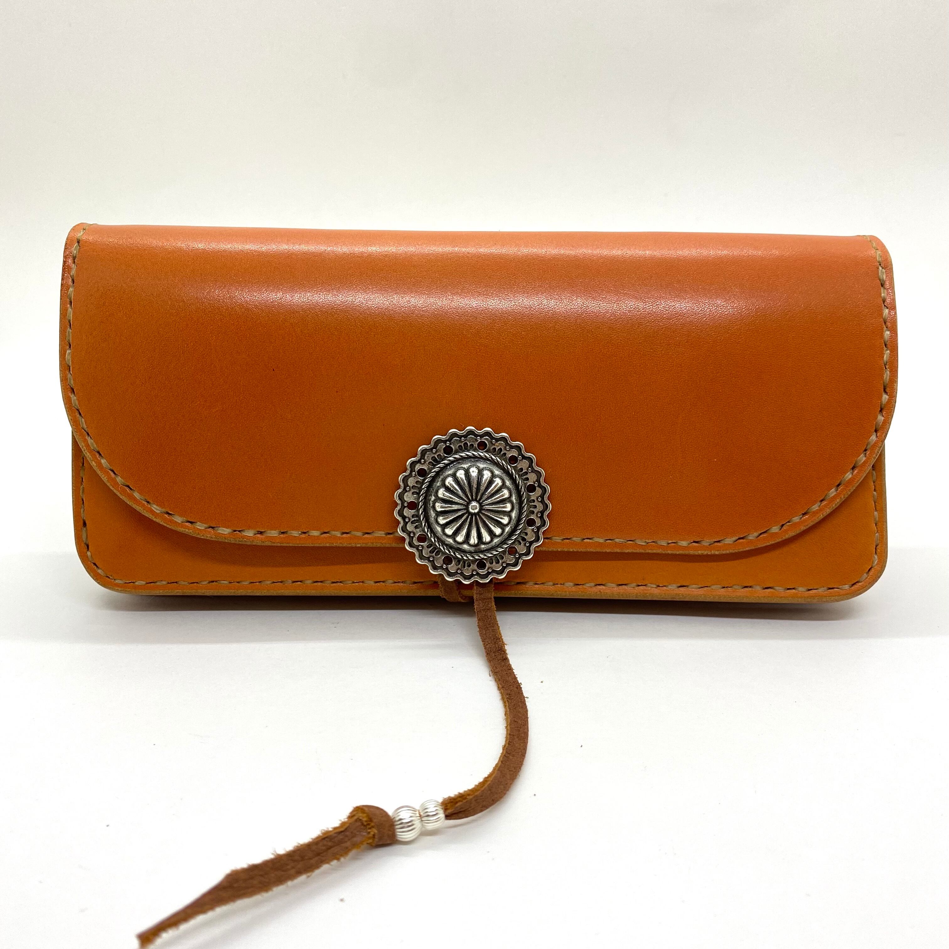 【即納☆送料無料】本革レザーウォレット 長財布 フラワーコンチョ オレンジキャメル 革紐