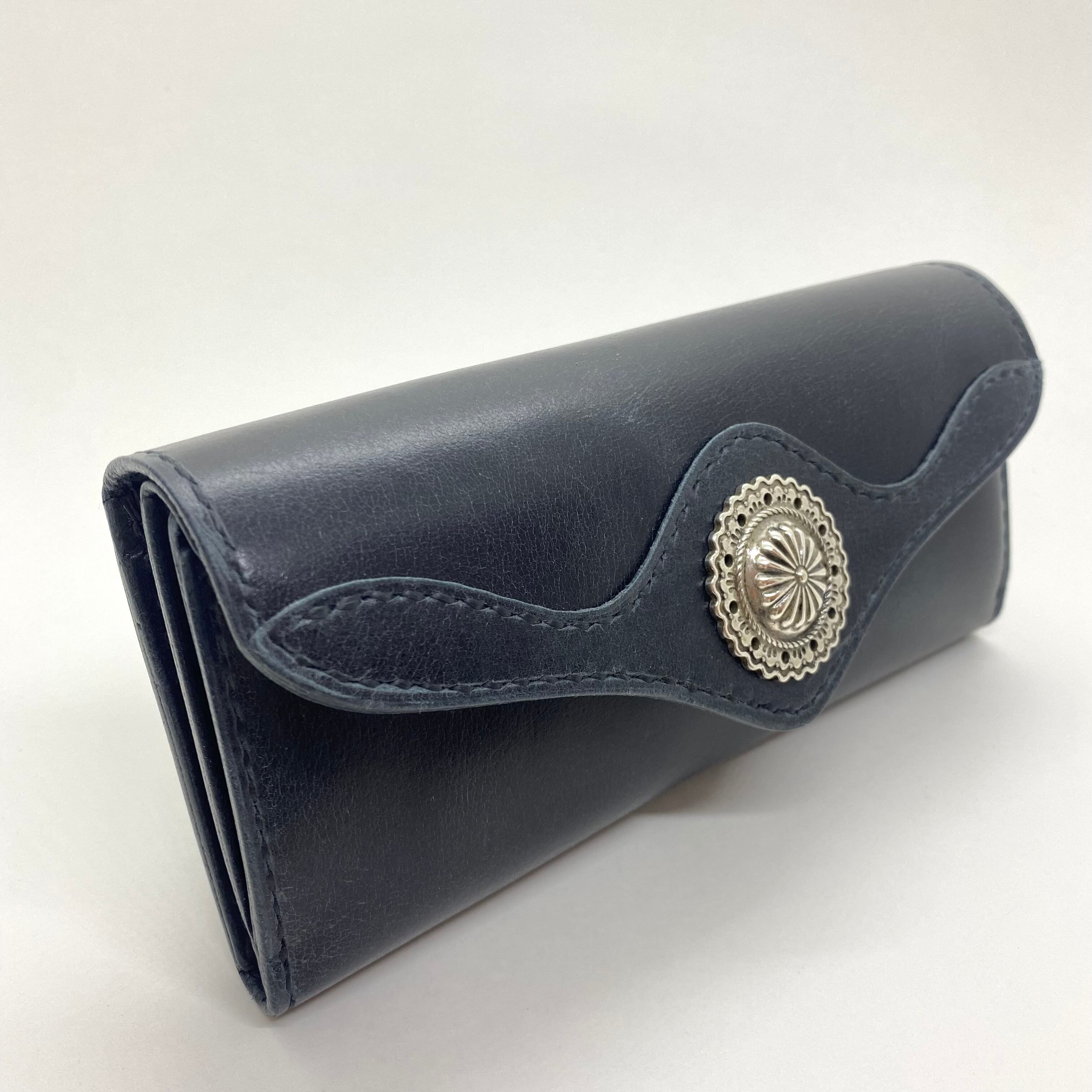【即納☆送料無料】本革レザーウォレット フラップボタン長財布 フラワーコンチョ 黒 ブラック