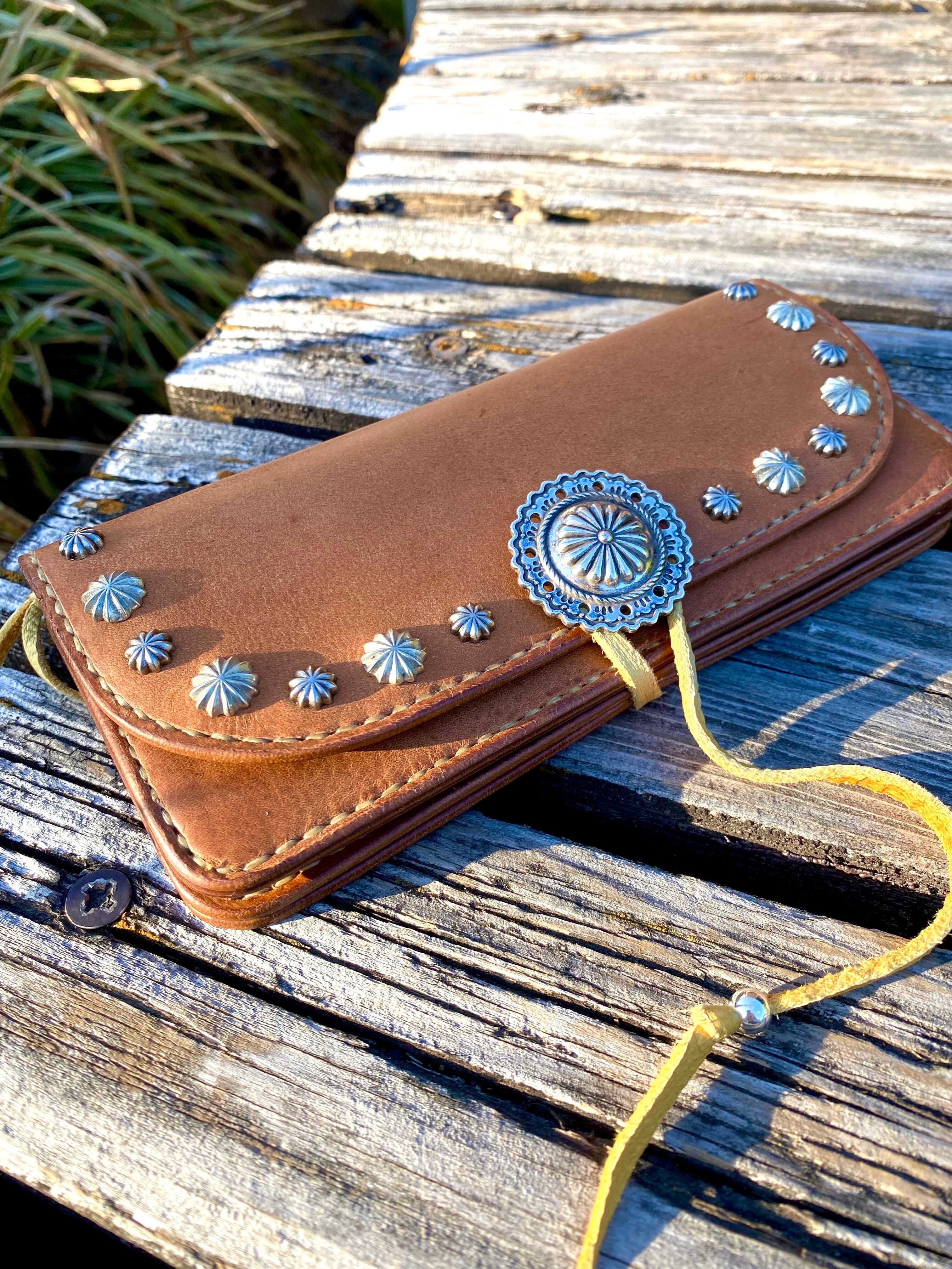 【即納☆送料無料】本革レザーウォレット 長財布 フラワーコンチョ アポロスタッズ 茶ブラウン 革紐